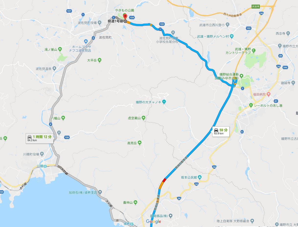長崎市内から通常であれば高速を使って1時間弱の距離です。