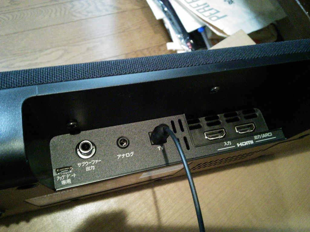 接続は簡単、サウンドバーをテレビに接続するだけです。最近の液晶テレビであればHDMI接続が一番良いのだと思いますが、我が家のプラズマテレビは、HDMI端子が塞がっている(HDレコーダー、クロームキャストウルトラ、Wii)ので光デジタル音声端子で接続しました。