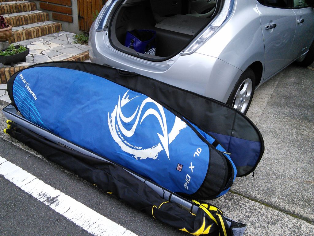ガソリン代ゼロでサーフィンに行きたくて、電気自動車EV日産リーフでロングボードとウインドサーフィンボードの中積みを試しました。