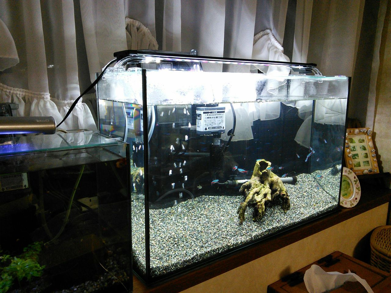 出窓部分に置くために、これまでは横60cm×奥行20cm×高さ23cmの水槽を使ってました。なんだか水が漏れているようなので、これを機会にもう少し背の高いスリム水槽に入れ替えました。