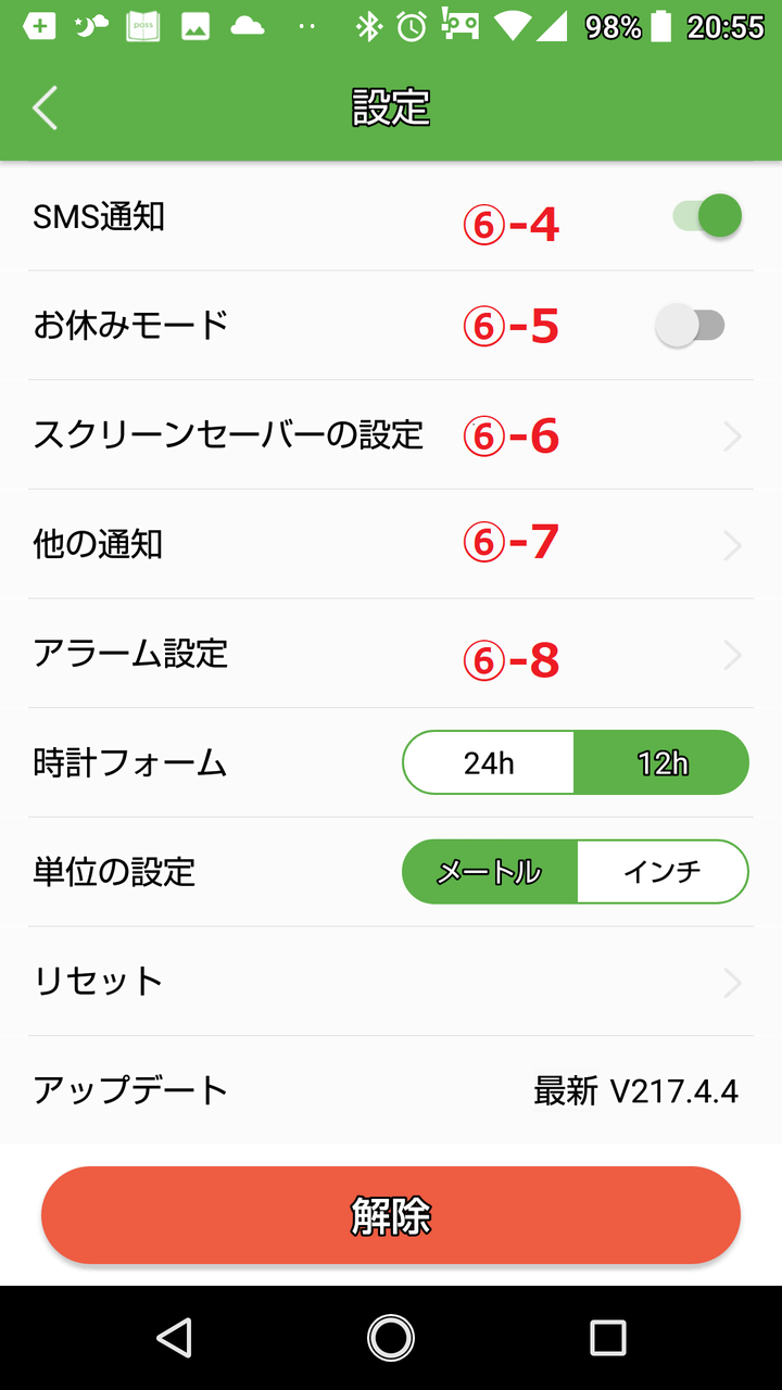 ⑥-4:SMSの着信を通知するかどうか設定します。