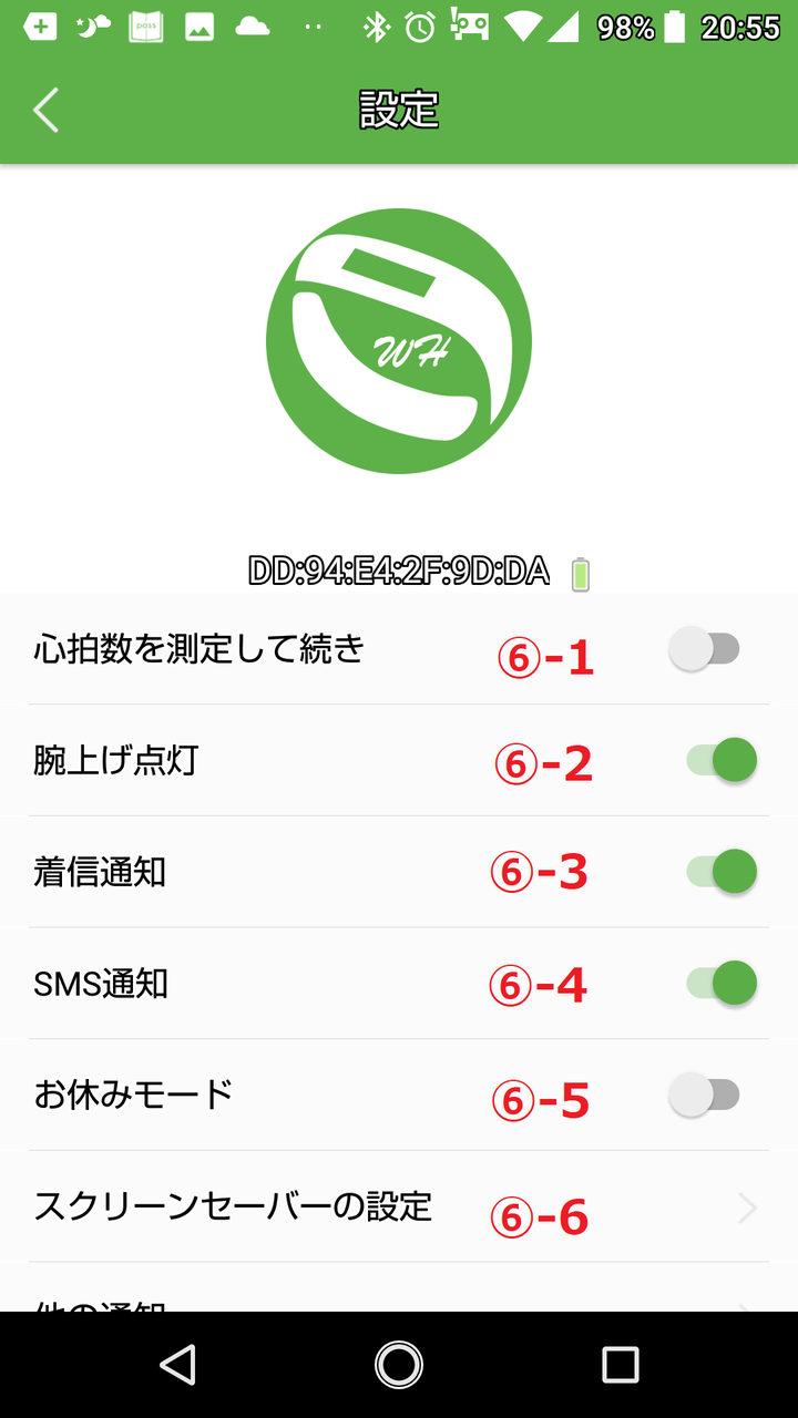 ⑥-1:継続して心拍数を測定するかどうか設定します。
