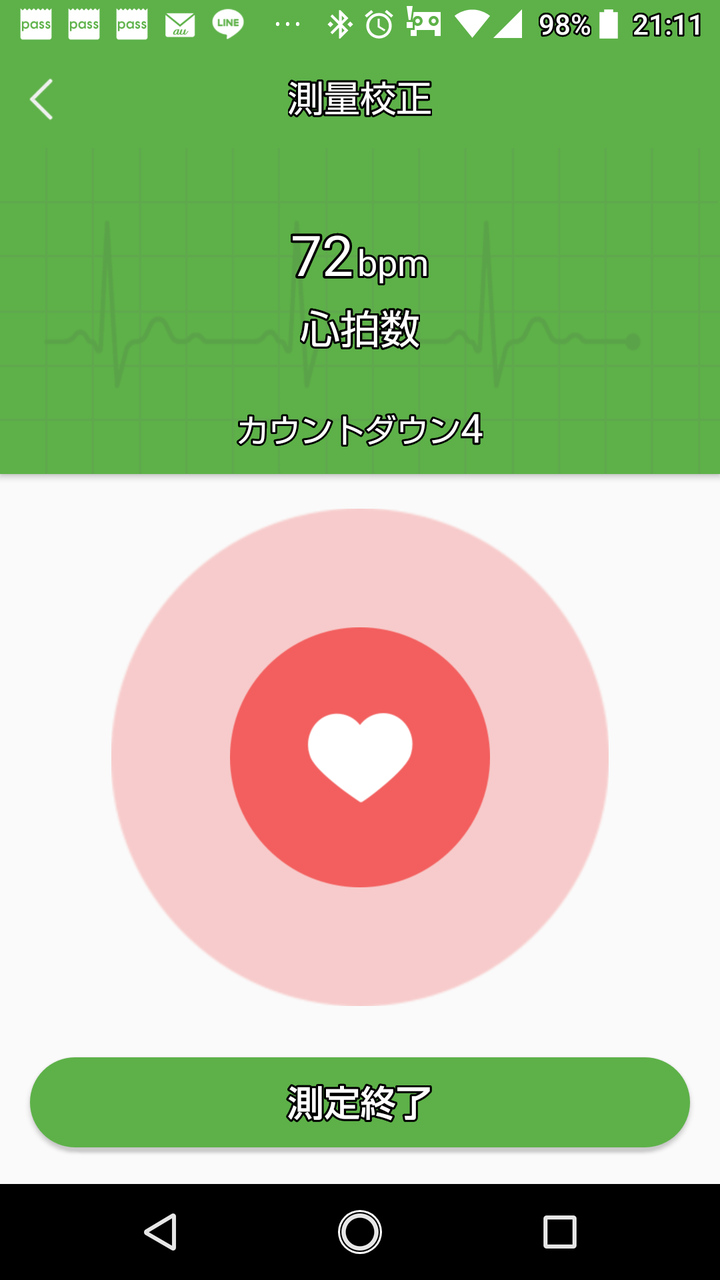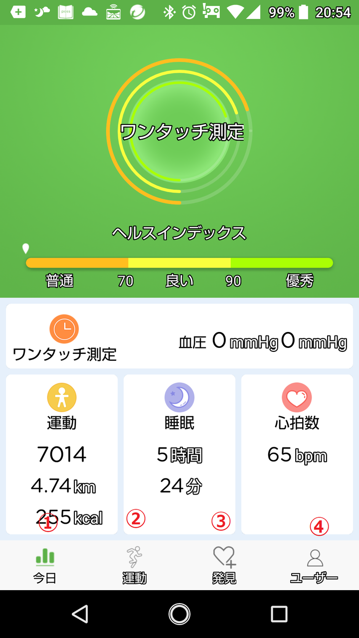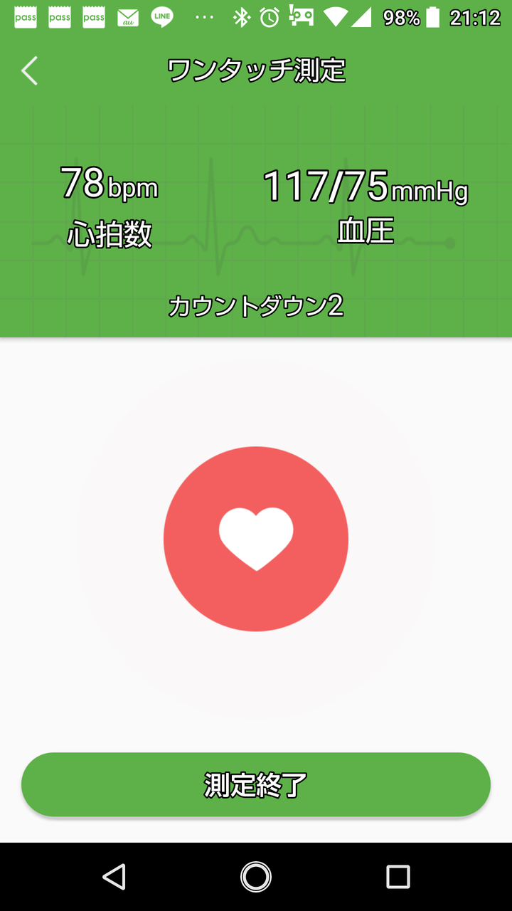 (1)-1「ワンタッチ測定」をタップすると血圧と心拍の測定ができます。