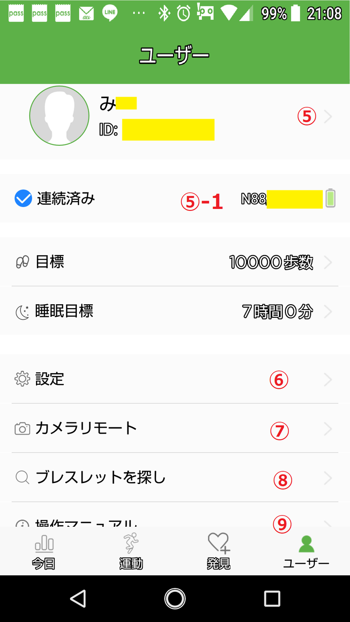 (5)「④ユーザー」→「⑧ブレスレット探し」